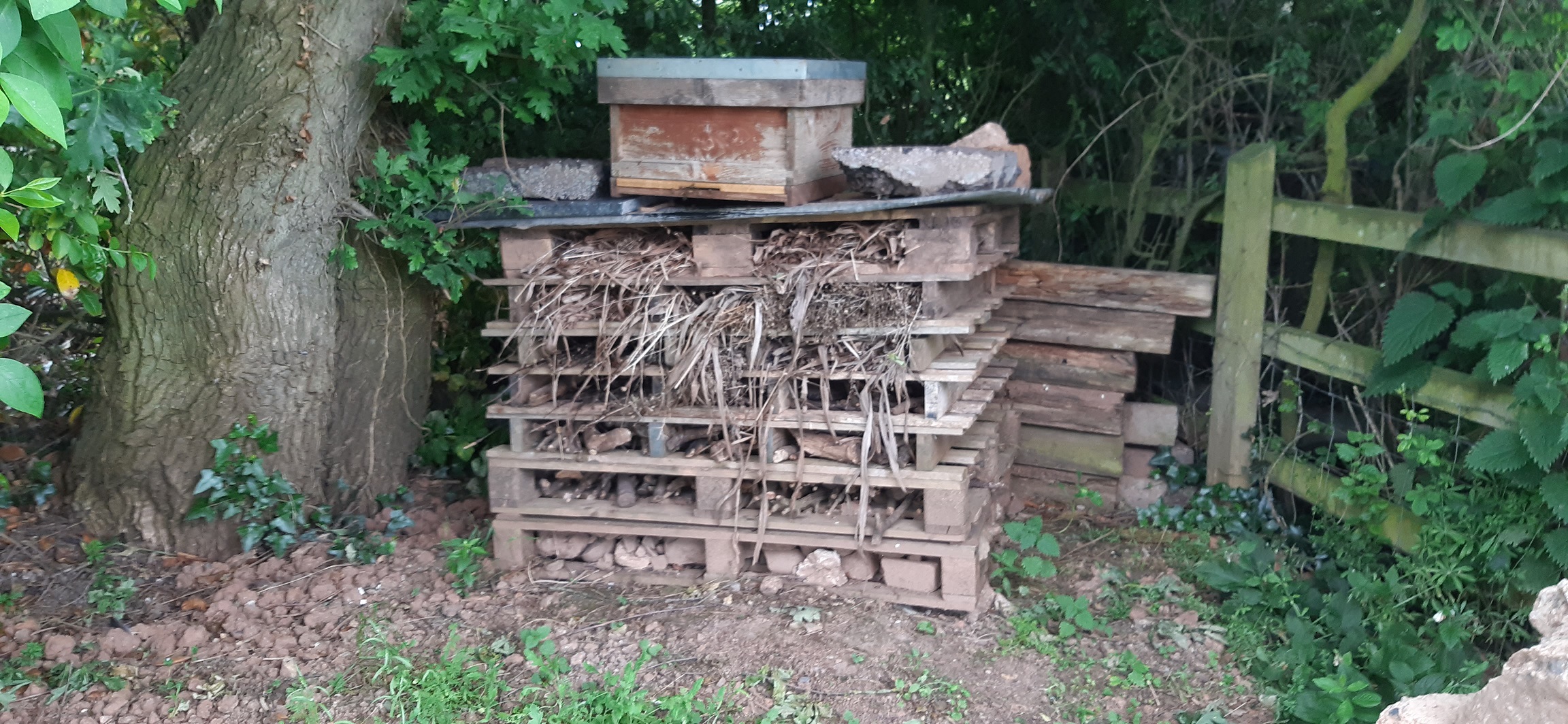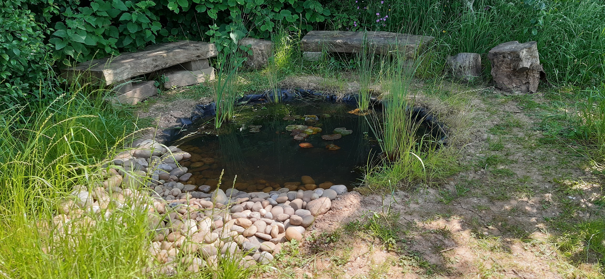In February 2023 we started digging out our wildlife pond which is situated in our wild area at the top of the orchard. It is 600mm deep in the middle with a shallow shelf round the edge and a pebble beach to allow access to wildlife. The edges will be allowed to naturalise and we hope that in time the pond liner will be covered by vegetation. Around the pond is some rustic seating which was located elsewhere in the garden when we purchased the property. Wild flowers have beem planted around the pond and a large bug hotel built using pallets is also in this area. Existing wild plants such as stinging nettles will be allowed to grow albeit with some management around the seating areas! The area is partly under a mature oak and provides a relaxing seating area where we can watch the pond life that is already beginning to establish itself. We have already spotted Great Diving Beatle larvae.